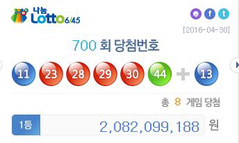 1등 당첨자의 1인당 당첨금은 총 20억8209만9188원이다. 2등 41명은 각 6771만원씩을 수령하며, 3등 1562명은 177만원, 4등(5만원)은 8만2874명, 5등(5천원)은 141만4076명이다.