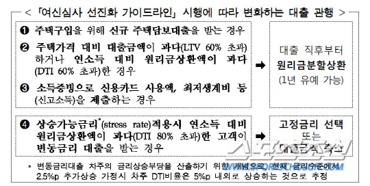 변동금리로 돈을 빌리려는 사람에 대한 제한도 높아진다. 금리가 더 오를 수 있는 점을 고려해 소득에 따른 대출 한도를 더 엄격하게 따지기로 한 것이다. 상승가능금리(스트레스 금리)를 추가로 고려했을 때 일정 한도를 넘어서는 대출은 고정금리 대출로 유도하거나 아예 한도를 넘지 않는 선에서만 대출을 받을 수 있다. 매월 내야 하는 원리금 상환부담액이 소득에 견줘 과중하다고 판단될 경우에는 은행이 별도 관리대상으로 지정한다.