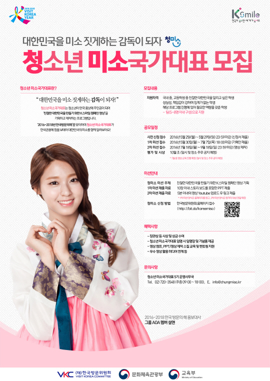 (재)한국방문위원회(위원장 박삼구)는 5월2~29일 홈페이지(www.vkc.or.kr)를 통해 청소년 K스마일캠페인 확산에 앞장서는 '청소년 미소국가대표' 5기를 모집한다.