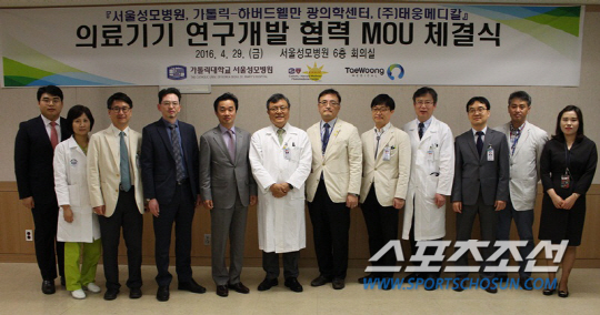 가톨릭대학교 서울성모병원(병원장 승기배)은 29일 병원 본관 6층 회의실에서 가톨릭-하버드웰만 광의학센터(센터장 최명규 소화기내과 교수), ㈜태웅메디칼(대표이사 신경민)과 소화기내시경 관련 의료기기 및 광역동치료 연구개발 협력을 위한 양해각서(MOU)를 체결했다고 밝혔다. 광역동치료란 종양에만 선택적으로 축적되는 광과민제를 주입한 후 특정파장의 빛을 조사하여 종양을 사멸하는 원리다.