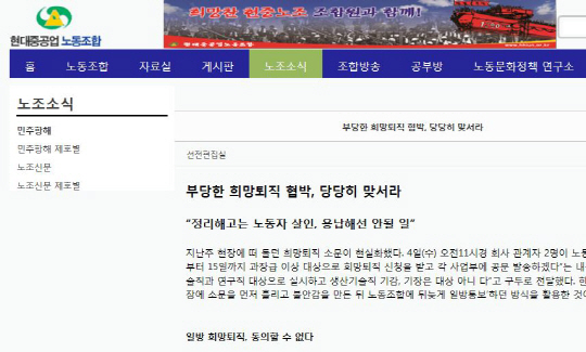 노조는 "지난 4일 회사 관계자 2명이 노조를 방문해 '9일부터 15일까지 과장급 이상 희망퇴직 신청을 받겠다'고 일방적으로 통보했다"며 "그동안 즐겨 쓰던 '현장에 소문을 먼저 흘리고 불안감을 만든 뒤 노동조합에 뒤늦게 일방통보'하던 방식을 활용한 것"이라고 지적했다.