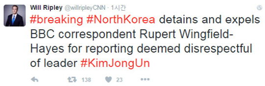 북한 7차 노동당 대회 취재를 위해 평양을 방문한 윌 리플리 CNN 기자는 자신의 트위터를 통해 "북한이 김정은 국방위원회 제1위원장과 관련한 불경스러운 보도를 했다며 윙필드-헤이스 기자를 구금하고 추방했다"는 글을 게재했다.