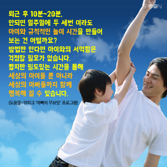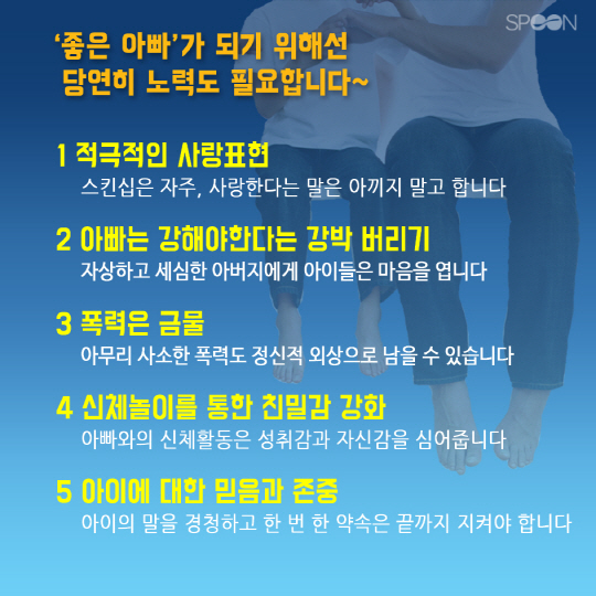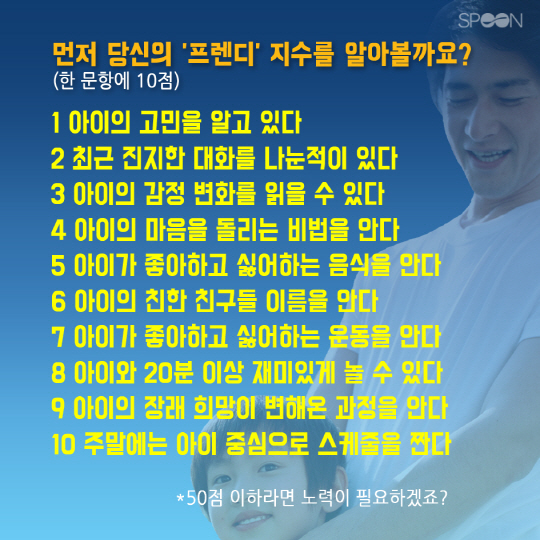 변화하는 시대의 흐름에 따라 아빠들의 모습도 달라지고 있습니다. 부모 공동 양육이 아이에게 긍정적 영향을 준다는 보고가 늘면서 가정에서의 아빠에 대한 기대와 역할도 많이 바뀌었습니다. 프렌드와 대디의 합성어인 '프렌디(friendy)' 는 이제 문화의 한 축이 되었습니다. 친구처럼 가깝고 친근한 모습은 요즘 시대 아빠들의 일반적인 모습입니다. 하지만 여전히 마음만 앞서고 방법을 몰라 고민하는 아빠들도 적지 않은게 사실입니다. 5월 가정의 달을 맞아 서툰 아빠들이 '프렌디'로 거듭나기 위한 조건과 방법들을 살펴보았습니다. 김변호 기자 bhkim@sportschosun.com