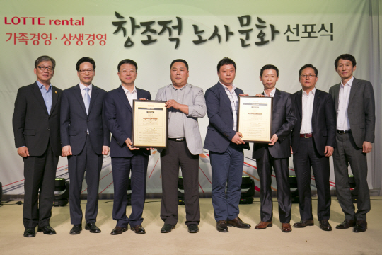 롯데렌탈이 신뢰를 바탕으로 노사간 상호 협력을 통해 기업가치창조, 직원행복창조, 사회적 가치창조를 달성하자는 내용을 담은 '창조적 노사문화' 도입을 선포했다. 롯데렌탈은 롯데그룹 고유의 노사문화에 적극 동참하고, 롯데그룹 편입 1주년을 기념하기 위해 12일 잠실에 위치한 롯데호텔 월드에서 '가족경영·상생경영 및 창조적 노사문화 선포식'을 개최했다고 13일 밝혔다.