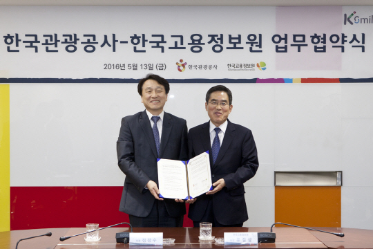 한국관광공사(사장 정창수)와 한국고용정보원(원장 유길상)은 13일 한국관광공사 서울센터에서 청년 관광일자리 활성화를 위한 업무협약을 체결하고 본격적으로 협업을 추진한다.