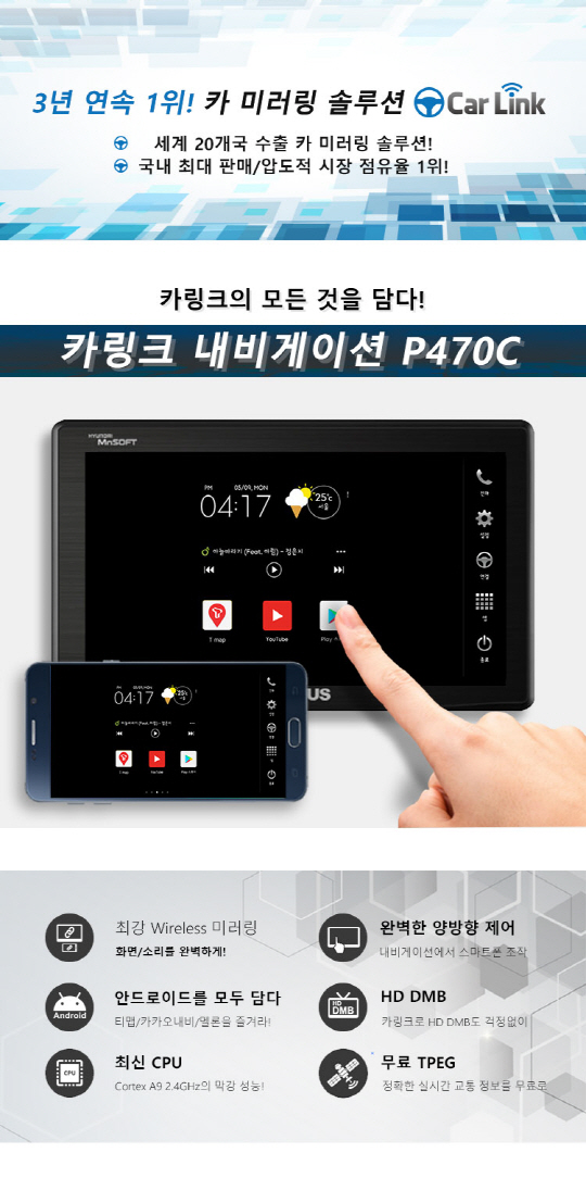 P470C 신제품 내비게이션은 7인치 LCD 디스플레이를 기반으로, 최강의 CPU로 Cortex A9 2.4GHz를 적용시킨 제품이다. 실시간 교통정보 TPEG(국내 송출규모 1위 KBS MOZEN TPEG)을 무료로 제공하며 지니 2D 맵이 탑재됐다. 다양하고 편리한 멀티미디어(DMB, PIP(내비게이션+멀티미디어 화면분할) 기능, 후방카메라 연결 기능 등) 기능과, 세련되고 직관적인 메뉴도 갖췄다.