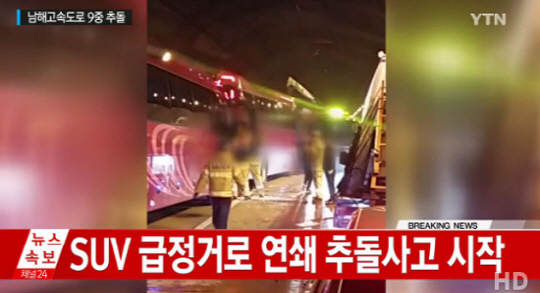 남해고속도로 9중 추돌사고가 발생해 4명이 숨지고 50여 명이 부상을 입었다.