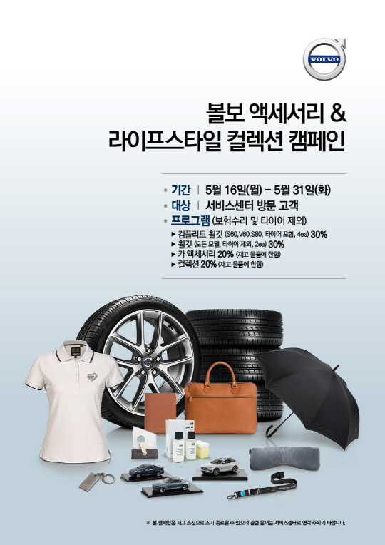볼보자동차코리아가 이달말까지 볼보자동차 서비스센터를 방문하는 모든 고객을 대상으로 최대 30%의 할인 혜택을 제공하는 '볼보자동차 액세서리 & 라이프스타일 컬렉션 캠페인'을 실시한다.