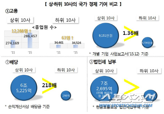 고용?배당·세금 등에서도 상위 10사가 앞섰다. 고용 측면에서 상위 10사는 4년 동안 종업원 수가 1만2288명(2011년 대비 2015년) 증가했지만, 하위 10사는 같은 기간 63명 증가에 그쳤다. 배당 역시 상위 10사는 6조가 넘어 하위 10사의 218배에 달했다. 법인세의 경우도 상위 10사가 7조2000억원을 납부해 2015년 전체 법인세 45조원의 16.0%를 담당했다. 반면 하위 10사 중에는 실적부진으로 법인세액이 0원인 기업이 1곳, 환급 받은 기업이 5곳으로 10사 중 4곳만이 법인세를 낸 것으로 조사됐다.