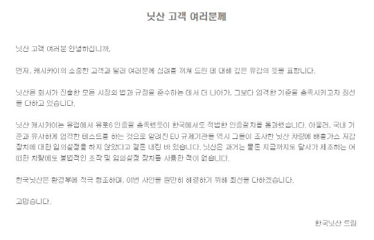 한국닛산은 환경부의 '캐시카이 배출가스 조작 확인' 발표가 나온 16일 자사 홈페이지에 '고객 여러분께'라는 제목의 글을 올렸다.