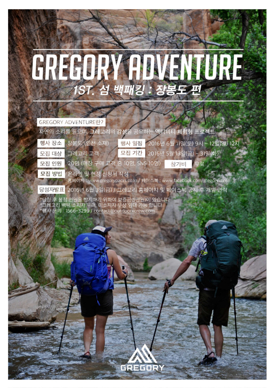 프리미엄 아웃도어 백팩 브랜드 그레고리가 본격 아웃도어 시즌을 맞아 1박2일 섬 백패킹을 떠나는 이색 이벤트 '그레고리 어드벤처(Gregory Adventure)'를 실시한다.