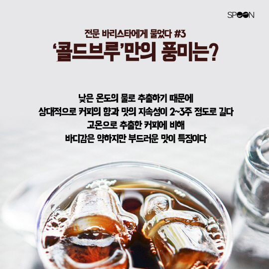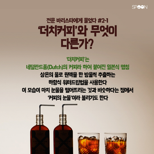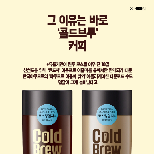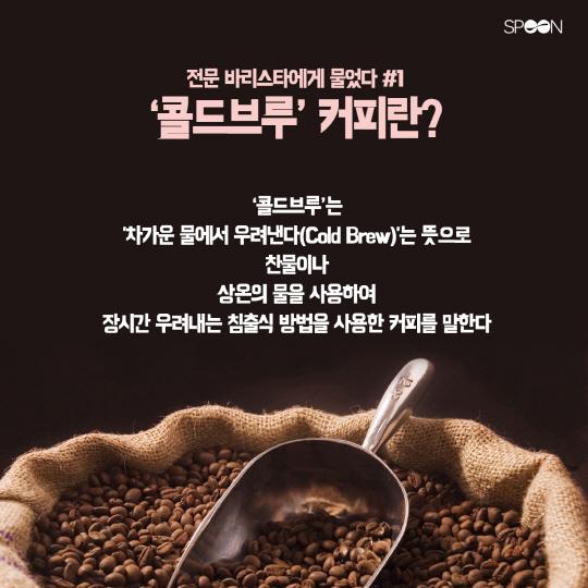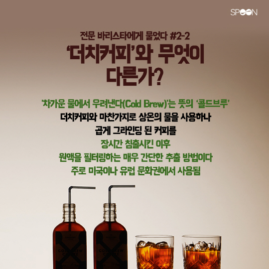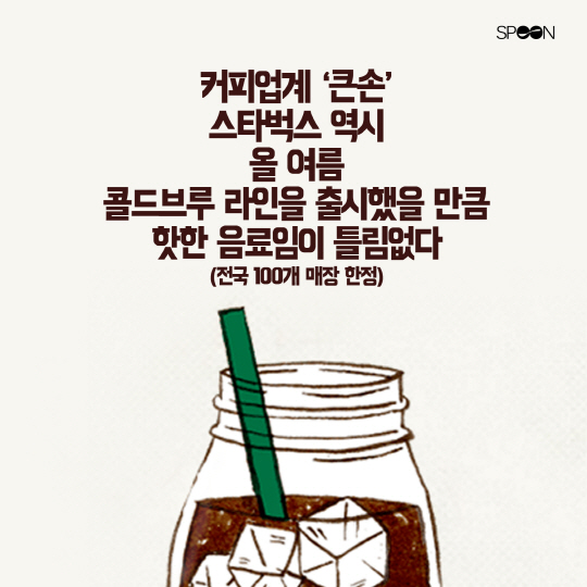 차가운 물에서 장시간 우려낸 커피인 '콜드브루(cold brew)'가 업계의 주목을 받고 있다. 한국야쿠르트가 지난 3월 선보인 '콜드브루 바이 바빈스키'는 하루 평균 10만개씩 팔리며 '커피계의 허니버터칩'으로 급부상하고 있다. 최고의 커피 맛과 향이 살아있는 열흘 동안만 야쿠르트 아줌마를 통해 구입할 수 있어 '야쿠르트 아줌마 찾기' 애플리케이션 다운로드 수도 크게 늘어났다. 이에 맞서 커피전문점도 냉커피 전쟁에 가세했다. 스타벅스는 지난달 아프리카와 라틴아메리카 원두를 섞은 전용 원두로 만든 콜드브루 커피 2종을 내놓았다. 지난해까지 여름이 되면 저온추출 방식인 '더치커피'가 유행한데 반해 올해엔 '콜드브루'라는 생소한 단어가 등장하며 소비자를 유혹하고 있다. '콜드브루'의 정확한 뜻과 '더치커피'와의 차이점 등을 전문 바리스타를 통해 궁금증을 해결해 봤다. 김수진 기자 vivid@sportschosun.com