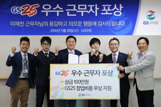 허연수 GS리테일 대표이사는 이달 18일 희생정신이 바탕이 된 용감한 행동으로 GS25 매니저의 명예를 높인 것에 대한 감사의 마음을 담아 표창장과 장학금(100만원), 그리고 GS25를 오픈 하고 싶어하는 이재천 매니저의 바람에 따라 가맹비와 보증금 없이 점포를 오픈 할 수 있는 기회를 제공했다.