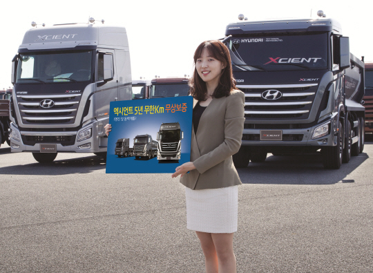 현대차가 업계 최초로 상용 대형트럭 엑시언트의 엔진/동력 계통 5년 무한 보증 서비스를 실시한다.