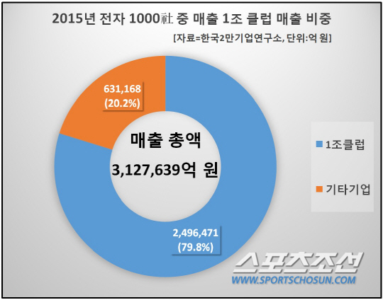 업계 매출 1위는 유일하게 100조 클럽에 든 삼성전자로 2015년 개별 재무제표 기준 매출은 135조2000여억원이다. 1000대 기업 매출의 43.2%다. 2위 LG전자는 28조3600여억원으로 매출 비중 9.1%를, 3위 삼성디스플레이가 26조3900여억원으로 8.4%, 4위 LG디스플레이가 25조8500여억원으로 8.3%, 5위 SK하이닉스는 18조7800여억원으로 6.0%의 비중을 각각 차지했다.