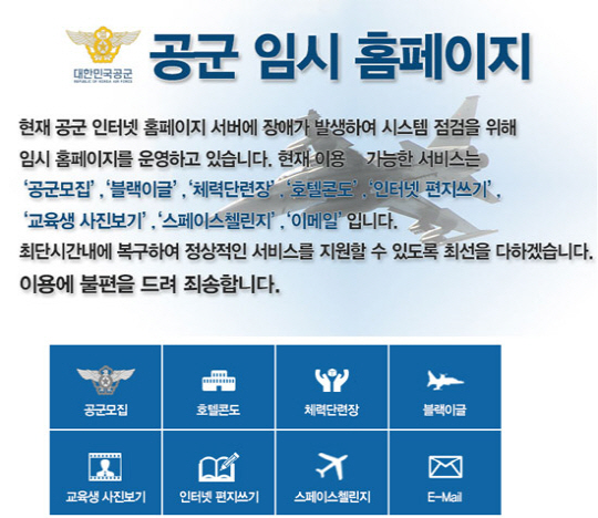 공군 임시 홈페이지 공지글에 따르면 현재 이용 가능한 서비스는 '공군모집' '블랙이글' '체력단련장' '호텔콘도' '인터넷 편지쓰기' '교육생 사진보기' '스페이스첼린지' '이메일' 기능이다. <스포츠조선닷컴>