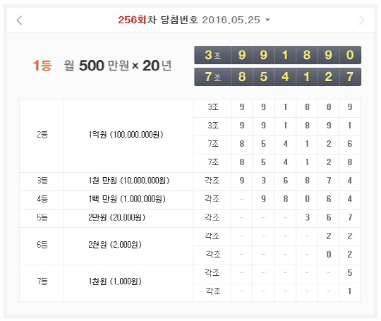 나눔로또는 연금복권520의 256회차 1등 당첨번호로 3조 991890번과 7조 854127번이 뽑혔다고 밝혔다.