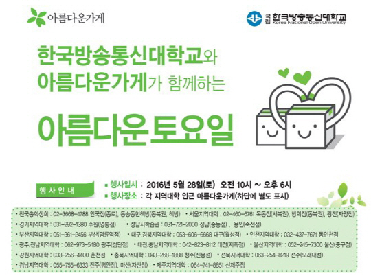 한국방송통신대학교가 28 아름다운가게와 함께하는 기부행사'아름다운 토요일'을 진행한다. 아름다운 토요일은 방송대의 교직원과 학생들이 모은 물품을 현장에서 판매하는 방식으로 진행된다.
