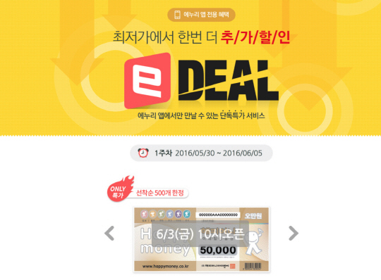 이번 이벤트는 에누리 모바일 앱을 통해서만 구입할 수 있으며 하루에 한 가지 상품을 선정해 에누리 최저가 쇼핑몰보다 더 저렴하게 판매한다. 이벤트 첫 주에 판매되는 상품은 해피머니 상품권, 영화상품권, 아이스 아메리카노 기프티콘 등 생활형 상품권들이며 2주차는 식료품 등 생활에 필요한 상품들이 판매될 예정이다.