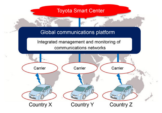 이번에 구축하는 글로벌 통신 플랫폼은 글로벌 공통 DCM을 탑재한 차량의 위치 정보로부터, 국가·지역 마다 선정한 통신 사업자에게로의 자동적인 접속, 전환과 통신 상태의 모니터링을 통합적으로 실시함으로써, 커넥티드카에 필요한 고품질의 안정된 통신을 글로벌하게 유지할 수 있다.