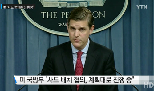 미국 국방부는 미국 고고도미사일방어체계, 사드의 한국 배치를 위한 한·미 양국의 협의가 계획대로 진행되고 있다고 밝혔다.