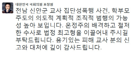 더불어민주당 표창원 의원이 신안군에서 일어난 교사를 성폭행한 학부모 사건에 대해 "학부모 주도의 의도적 계획적 조직적 범행의 가능성이 높아 보인다"고 주장했다.