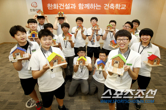 한화건설은 지난 7일 본사에서 서울 봉림중학교 학생을 대상으로 '한화건설과 함께하는 건축학교'를 진행했다. 학생들은 회사 임직원으로부터 건축과 관련한 다양한 직업에 대해 듣고 집짓기 모형을 통해 간접 경험을 쌓았다.