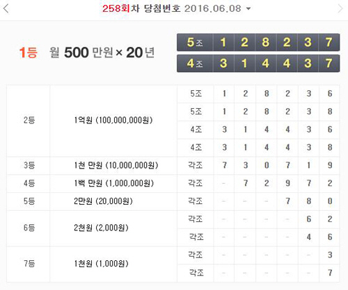 3등 당첨번호는 각조 '730719'으로 당첨금은 1000만원이다. 4등은 각조 끝자리 '72972'로 당첨금은 100만원이다. 당첨금이 2만원인 5등은 각 조 끝자리 '780'이다. 당첨금 2000원을 받는 6등은 각조 끝자리 '46', '62'이다. 1000원을 받는 7등 당첨번호는 각조 끝자리 '3'번과 '7'번이다.