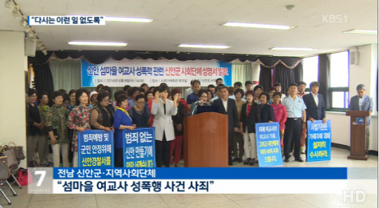 전남 신안군 섬에서 발생한 여교사 성폭행 사건과 관련 해당 마을 주민은 물론 군과 시의회, 지역사회단체 등 지역사회가 피해자와 가족-국민에게 사죄했다.