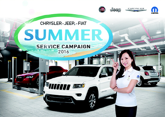 피아트 크라이슬러 코리아(FCA 코리아)는 13일부터 7월 16일까지 5주간 크라이슬러-지프-피아트의 전 차종을 대상으로 전국 공식 서비스센터에서 '2016 여름 서비스 캠페인'을 진행한다.