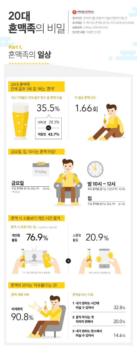 13일 20대 전문 연구기관 대학내일 20대연구소는 주 1회 이상 혼맥을 즐기는 전국 20대 남녀 500명을 대상으로 '20대 혼맥 트렌드' 조사결과를 발표했다.