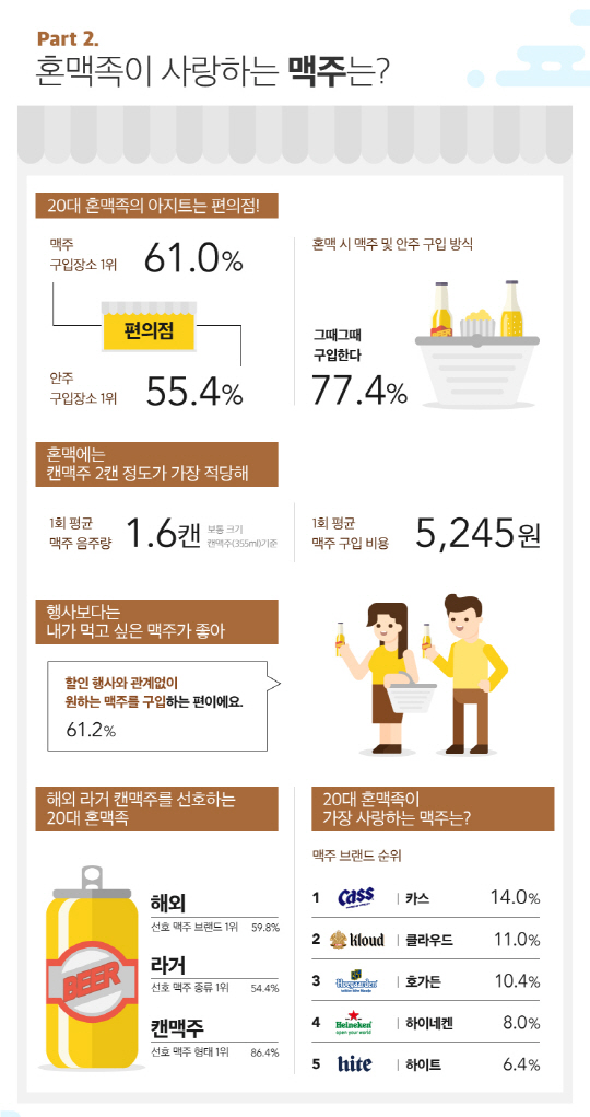 1회 평균 맥주 음주량에 대한 응답은 평균 1.6캔(355㎖ 기준)으로 약 2캔 정도의 음주를 하는 것으로 나타났다. 할인 행사와 관계 없이 원하는 맥주를 구입(61.2%)하며, 해외 라거 캔맥주를 선호(59.8%)하는 모습을 보였다.