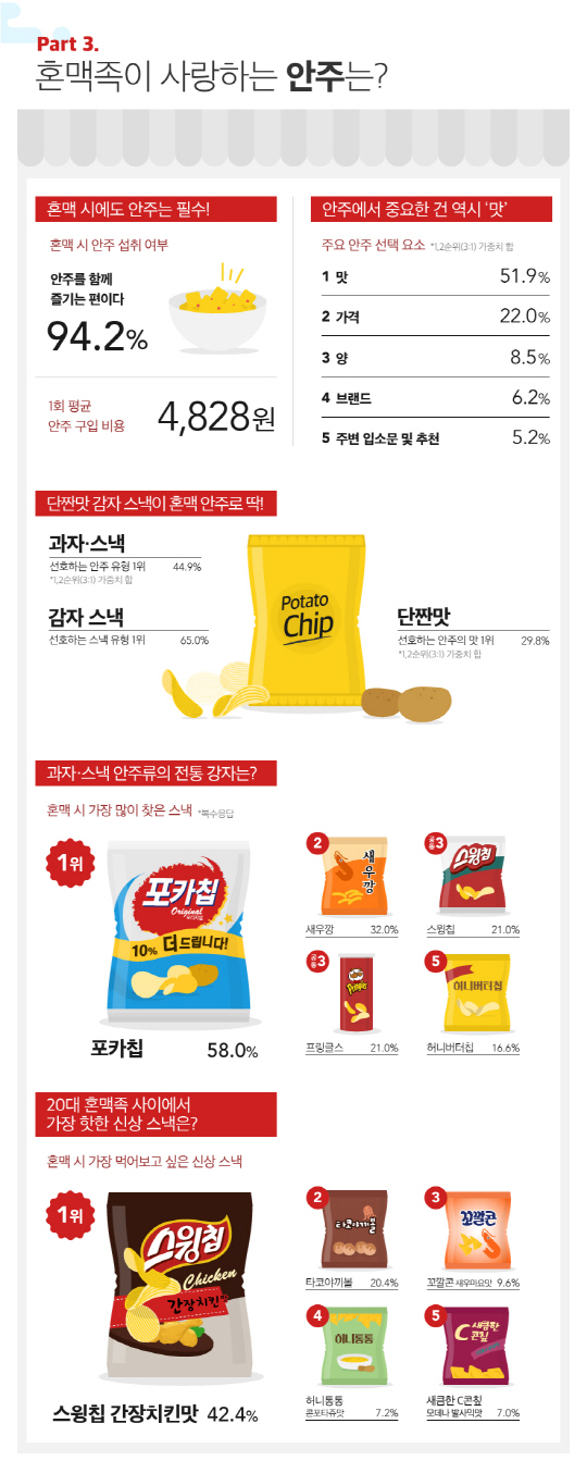 특히, 단짠맛(단맛+짠맛, 29.8%)의 감자스낵(65%)을 선호했으며 가장 많이 찾은 스낵은 포카칩(58%)이라고 답했다. 최근 3개월간 출시된 신제품 중 가장 먹어보고 싶은 신상 스낵으로 스윙칩 간장치킨맛(42.4%)이 1위를 차지했다. 한편, 20대 혼맥족은 1회 평균 맥주 구입 비용으로 5245원, 안주 구입 비용으로 4828원을 사용하는 것으로 조사됐다.
