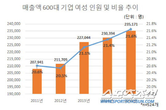 전국경제인연합회는 14일 매출액 상위 600대 상장기업(금융·보험업 제외) 중 2011∼2015년 사이 남녀비율 분석이 가능한 524개 기업을 조사한 결과 이같이 나타났다고 밝혔다.