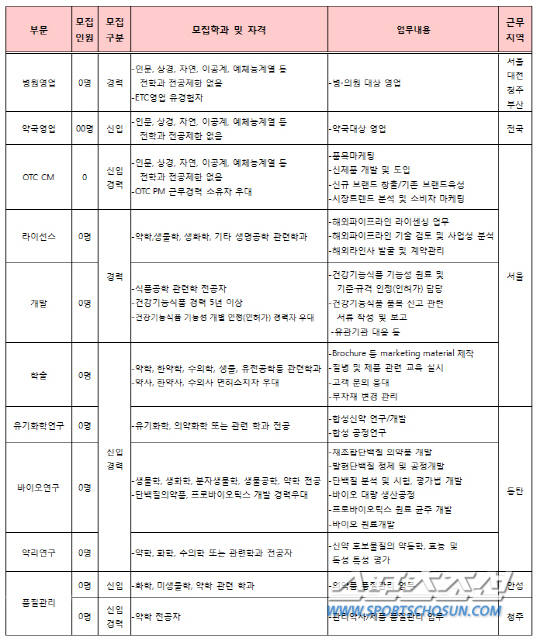 단, 영업 및 OTC CM 분야는 전공제한은 없지만 병원영업은 경력자만 지원가능하고, OTC CM 분야는 관련 분야 근무 경력자를 우대한다. 학술 분야는 약학, 한약학, 수의학, 생물, 유전공학 등 관련학과 전공자로서 약사, 한약사, 수의사 면허 소지자는 우대된다.