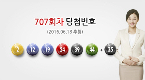 한편, 나눔로또는 지난 18일 실시된 제707회 로또복권 추첨에서 '2, 12, 19, 24, 39, 44'가 1등 당첨번호로 뽑혔다고 밝혔다. 2등 보너스 번호는 '35'다.
