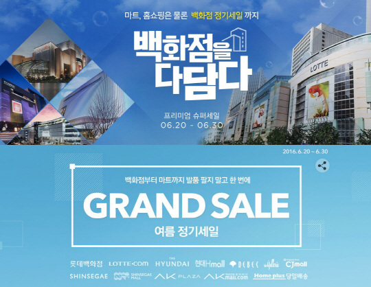 오는 7월 4일부터 7월 10일까지는 백화점 오프라인 여름 정기세일 기간에 맞춘 공동 할인행사를 진행한다. G마켓과 옥션 동시에 진행되는 '백화점 정기세일'에서는 롯데백화점, 신세계백화점, 현대백화점, 갤러리아백화점, AK플라자, 대구백화점 등 6개의 백화점이 참여한다. 오프라인 할인 가격에 각 사이트별 할인쿠폰을 적용하면 더욱 알뜰하게 구매할 수 있다.