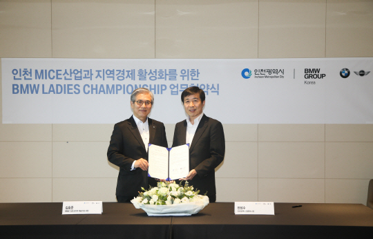 김효준 BMW 그룹 코리아 대표이사 사장(왼쪽)과 전성수 인천광역시 행정부시장이 인천 MICE 산업과 지역경제 활성화를 위한 BMW 레이디스 챔피언십 업무협약식에서 기념 촬영을 하고 있다.