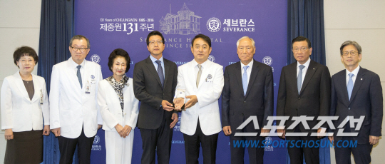고 방우영 조선일보 상임고문의 유족이 21일 서울 신촌세브란스병원에서 고인 명의로 기부금 1억5000만원을 전달했다. 왼쪽부터 박정숙 세브란스병원 간호국 부원장, 장준 연세의료원 기획조정실장, 이선영 고 방우영 상임고문의 부인, 방성훈 스포츠조선 대표, 정남식 연세의료원장, 김석수 연세대 재단이사장, 박삼구 연세대 총동문회장, 이재용 연세대 교학부총장. 사진제공=조선일보