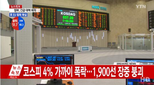 24일 영국의 브렉시트(영국의 유럽연합 탈퇴) 관련 국민투표 개표가 50% 지난 시점에서 탈퇴가 4%포인트 가량 앞서는 것으로 나온 가운데 국내 주식시장이 폭락하며 코스닥시장에 사이드카가 발동했다.