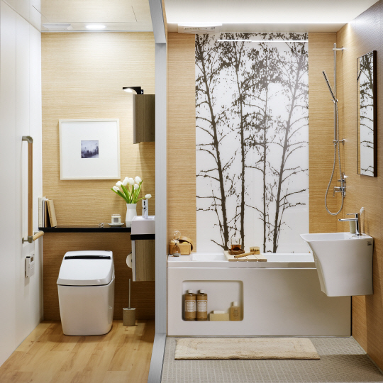 이중 토일렛형 유닛: 욕실의 배변공간을 별도의 공간으로 분리해 가족구성원이 함께 욕실을 사용할 수 있다. 또 방수처리 된 마루 소재를 바닥에 사용해 물기 없는 건식 공간을 완성한다. 큐브형 유닛: 욕조형·샤워형으로 구성되며 벽 3면에 배관설계가 자유로워 샤워기와 세면기 설치에 제약이 없다. 환풍·난방·건조기능이 포함된 스마트복합환풍기로 쾌적한 욕실공간을 연출할 수 있다.