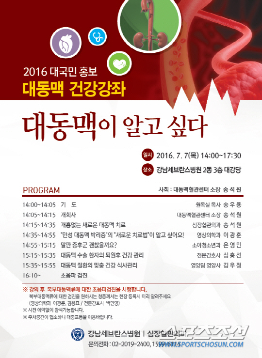 강남세브란스병원은 오는 7월 7일 오후 2시부터 병원 3층 대강당에서 대동맥 건강강좌를 개최한다고 밝혔다.