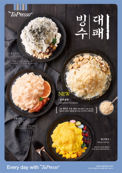 커피 프랜차이즈 '토프레소'는 '콩떡콩떡 대패빙수'를 앞세워 여름 빙수 시장을 공략하고 있다. 토프레소의 콩떡콩떡 대패빙수는 지난해 출시돼 많은 사랑을 받았던 대패빙수 3종 '자몽자몽', '망고망고', '꼬소꼬소'의 후속작이다. 진하고 부드러운 젤라또 우유 얼음에 담백하고 고소한 토프레소 전용 콩고물과 인절미를 함께 얹은 것이 특징이다. 여기에 추억을 자극하는 간식 '달고나'를 더해 씹는 재미를 살렸다.