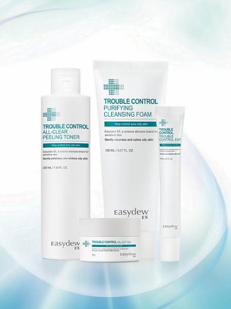 이지듀EX 트러블컨트롤 라인은 여드름성 민감한 피부의 집중 트러블 케어 화장품이다. 클렌징-필링-리페어-올 데이케어의 네 단계 기초 제품으로 여드름성 피부의 증상 완화 및 재발 방지를 위한 솔루션을 제공한다. 피부 보습 막을 강화해주는 성분 함유되어 항염, 피지 분비 억제, 피부 진정 및 각질관리에도 도움이 된다. 실제 중앙대학교에서 20~50세 중증 여드름 환자를 대상으로 4주간 진행한 임상시험에서 코와 뺨 부위의 피지 분포 면적이 감소하는 결과를 얻었다.