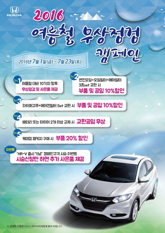 혼다코리아가 본격적인 여름 휴가를 앞두고 자사 고객들의 안전한 여름 휴가를 지원하기 위해 7월 1일부터 23일까지 3주간 여름철 무상점검 캠페인을 진행한다.