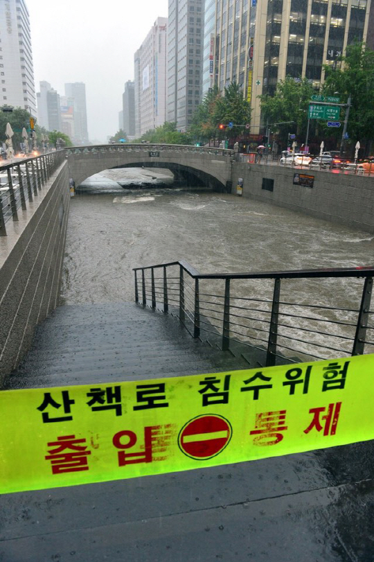 서울시는 트위터, 페이스북 등 소셜네트워크 서비스(SNS)를 통해 '어제부터 쏟아진 많은 비로 현재 #청계천 산책로 거의 전 구간이 #출입통제 되고 있습니다. 내일까지 중부지방에 최고 150mm의 폭우가 쏟아진다고 합니다. 안전사고에 유의하시기 바랍니다. #서울시 #호우특보'라고 알린 후 폭우 피해 예방 및 안전관리에 만전을 기할 것을 호소했다. <스포츠조선닷컴>