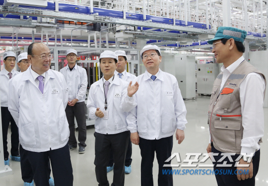 김 회장은 한화큐셀 남성우 대표이사로부터 진천 셀공장에서 양산된 제1호 태양전지로 만든 기념패를 받고, 임직원들을 격려하는 문구가 인쇄된 미니모듈을 전달했다.