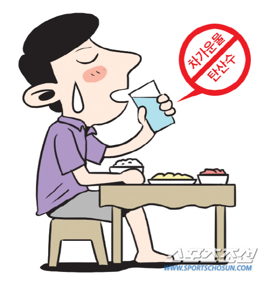 여름철이 되면 얼음을 동동 띄운 차가운 물을 마시면 속이 시원해지고 더부룩함이 가신다. 그러나 특히 식사 전에는 찬물보다 미지근한 물을 마시자. 너무 차가운 물을 갑자기 마시면 소화기관 인접 혈관이 수축돼서 장 기능도 떨어진다. 또, 소화 효소는 체온에 최적화돼 작용하는데, 얼음물을 마시면 체온이 낮아지면서 효소 기능이 떨어진다. 운동 후 찬물을 급하게 마시면 종종 설사가 나는데, 이는 소화·흡수가 잘 안돼 수분이 몸 밖으로 너무 빨리 배출되는 것이다. 또한 위장이 예민한 사람이 찬물을 마시면 복통과 설사가 잘 생긴다. 불가피하게 찬물을 마실 때는 천천히 씹듯이 마셔야 배앓이를 예방할 수 있다.