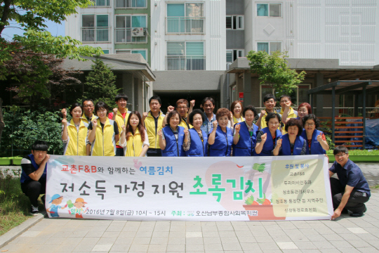 교촌치킨을 운영하는 교촌에프앤비가 지난 8일 경기도 오산에서 여름 김치를 담가 저소득층 가정에 지원하는 '초록김치 행사'를 진행했다고 11일 밝혔다.