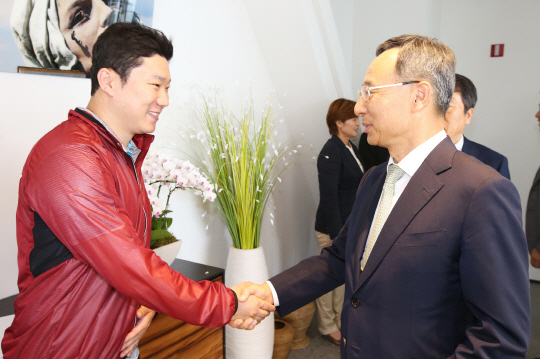 황창규 KT 회장이 11일 서울 종로구 KT광화문사옥에서 KT스포츠 소속으로 리우 올림픽에 출전하는 사격, 하키 종목의 선수들을 위한 격려행사를 진행했다. 행사에는 사격 종목의 진종오, 한승우와 여자하키 종목의 한혜령, 김보미, 서정은, 장희선, 정해빈 총 7명이 참석했다.